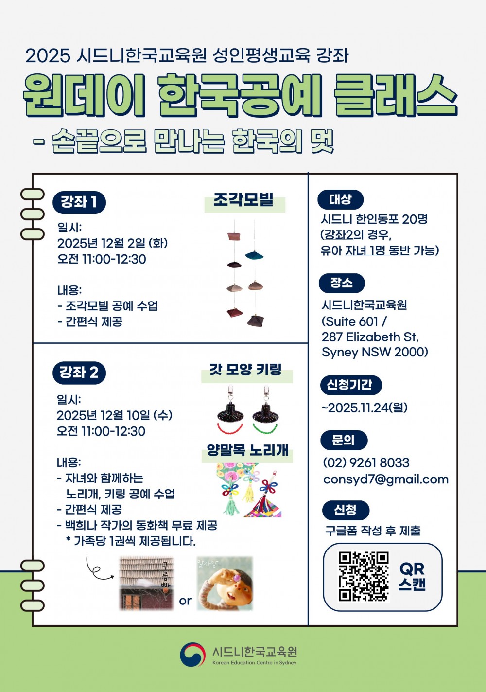시드니한국교육원에서는 2025년 성인 평생교육 프로그램의 일환으로 '원데이 한국공예 클래스'를 운영합니다.